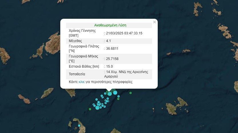 Ένας σεισμός μεγέθους 4,1 βαθμών στην κλίμακα Ρίχτερ καταγράφηκε στις 05:47 το πρωί της Παρασκευής στην περιοχή της θάλασσας ανάμεσα στη Σαντορίνη και την Αμοργό. Το επίκεντρο της σεισμικής δόνησης εντοπίστηκε 14 χιλιόμετρα νότια-νοτιοδυτικά της Αρκεσίνης στην Αμοργό, ενώ το εστιακό βάθος υπολογίστηκε στα 15 χιλιόμετρα, σύμφωνα με τα δεδομένα του Γεωδυναμικού Ινστιτούτου.